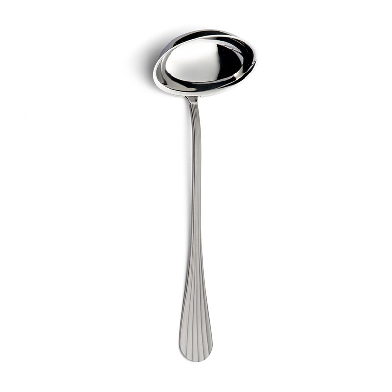 Il design arrotondato nella parte finale del manico e le linee di decoro continue che percorrono la lunghezza della posata creano un suggestivo effetto plissé, esaltato dal raffinato gioco di luce e ombra.