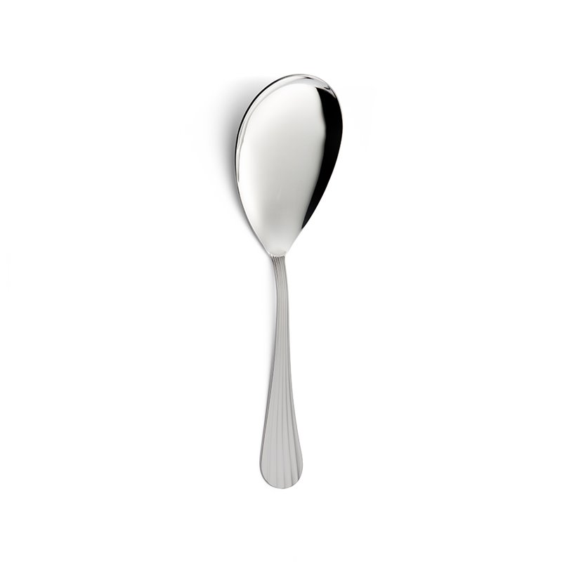 Il design arrotondato nella parte finale del manico e le linee di decoro continue che percorrono la lunghezza della posata creano un suggestivo effetto plissé, esaltato dal raffinato gioco di luce e ombra.