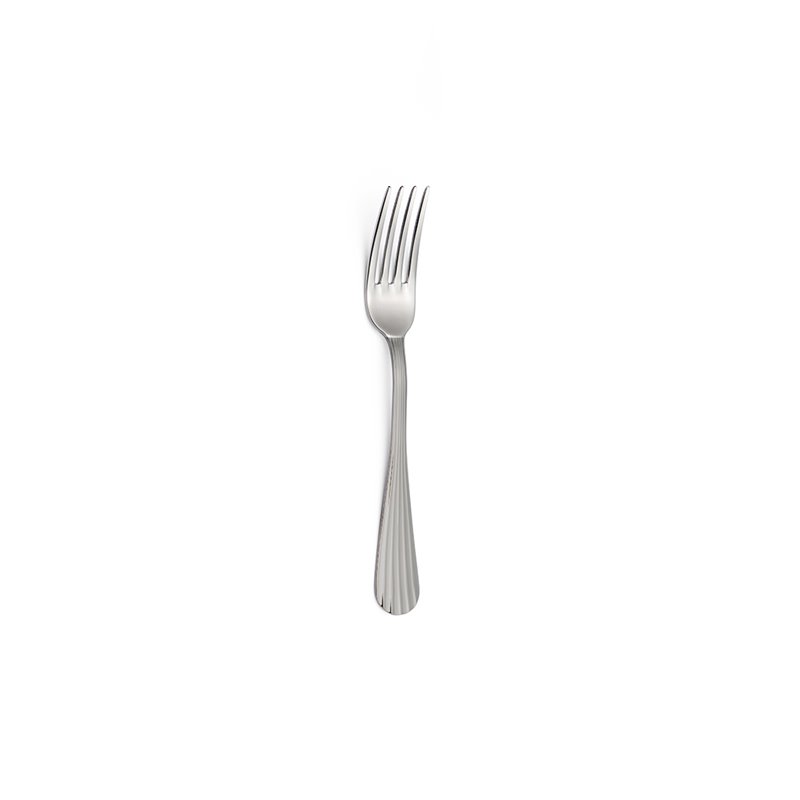 Il design arrotondato nella parte finale del manico e le linee di decoro continue che percorrono la lunghezza della posata creano un suggestivo effetto plissé, esaltato dal raffinato gioco di luce e ombra.
