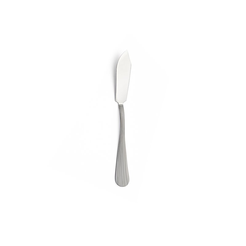 Il design arrotondato nella parte finale del manico e le linee di decoro continue che percorrono la lunghezza della posata creano un suggestivo effetto plissé, esaltato dal raffinato gioco di luce e ombra.