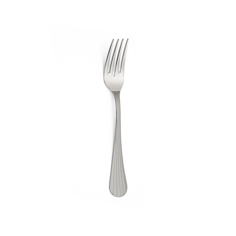 Il design arrotondato nella parte finale del manico e le linee di decoro continue che percorrono la lunghezza della posata creano un suggestivo effetto plissé, esaltato dal raffinato gioco di luce e ombra.