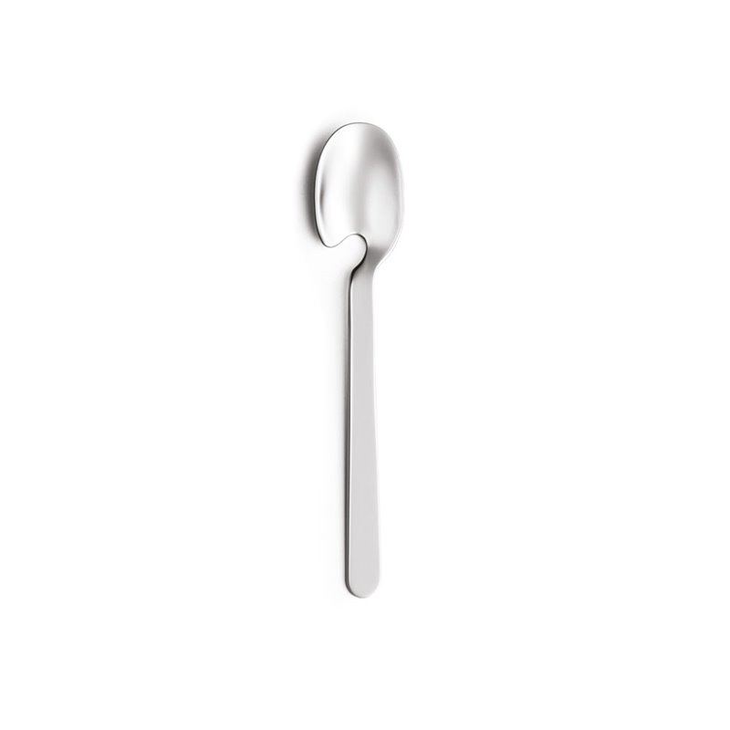 Il suo tratto distintivo è l’incavo morbido che collega la coppa al manico: una sinuosa rientranza che alleggerisce il profilo e crea un segno inaspettato, quasi un piccolo “morso” nel metallo, raffinato richiamo al mondo della golosità.