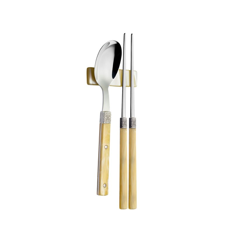 Composto da cucchiaio frutta 190 mm, una coppia di chopstick 220 mm e un poggia posate 75x25xh6 mm, porta in tavola l’eleganza della convivialità contemporanea, dove culture diverse si incontrano con naturalezza.