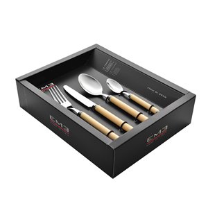è una collezione di posate in acciaio inossidabile 18/0 con finitura lucida e manico saldato ad ultrasuoni in acrilico sovrastampato.