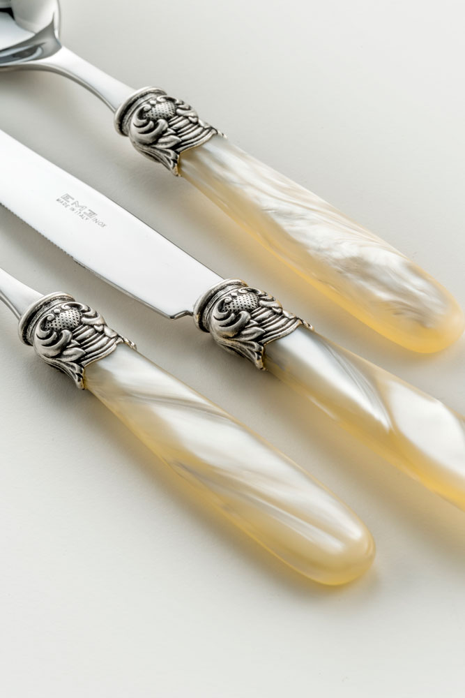 Mona Lisa è una collezione di posate di ispirazione classica che, con le ghiere di giunzione argentate e anticate, riporta alla mente gli antichi fregi che decoravano i capitelli delle colonne. Presenta manici colorati ad effetto madreperla dalla forma morbida e con terminali arrotondati. I vari colori disponibili madreperlati e la gamma completa di articoli permettono di creare personali abbinamenti con porcellane e vasellame in stile classico anche nella quotidianità.