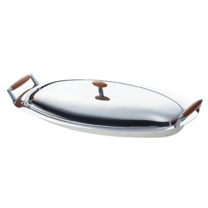 Apollo è una collezione di vassoi e complementi per la tavola in acciaio inossidabile 18/10 lucidato a specchio con maniglie in legno.