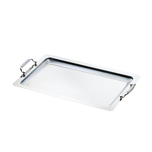 è una collezione di vassoi e complementi per la tavola in acciaio inossidabile 18/10 lucidato a specchio con maniglie in metallo.
