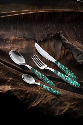 Vero Jungle è una collezione di posate disponibile in una gamma di 12 articoli e in 2 nuance glamour: verde e turchese.